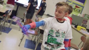 – [Narrador] Os alunos pegarão suas máscaras, amarrarão suas capas e se juntarão à Força de Inovação! Ka-pow, enfrente uma equipe de supervilões, resolva os