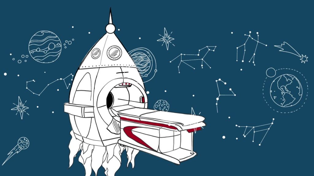 o procedimento de ressonância magnética em uma grande aventura espacial. Agora, os ruídos altos são a